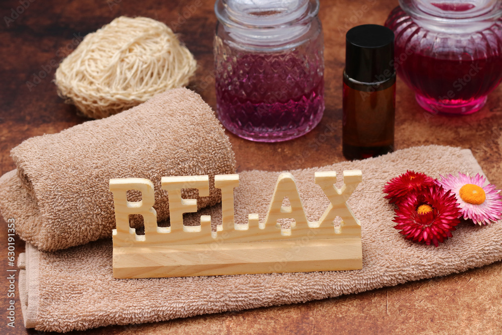 Spa- und Wellnessbereich mit Duftkerze, Handtüchern, Essenzen und dem Schriftzug Relax.