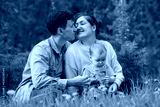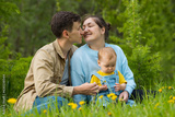 Happy smiling family of mother father and girl child cheerfully sits in flourishing meadow. Husband kisses wife while daughter plays with flowers