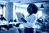 Beautiful African businesswoman in office. Young woman using digital tablet.