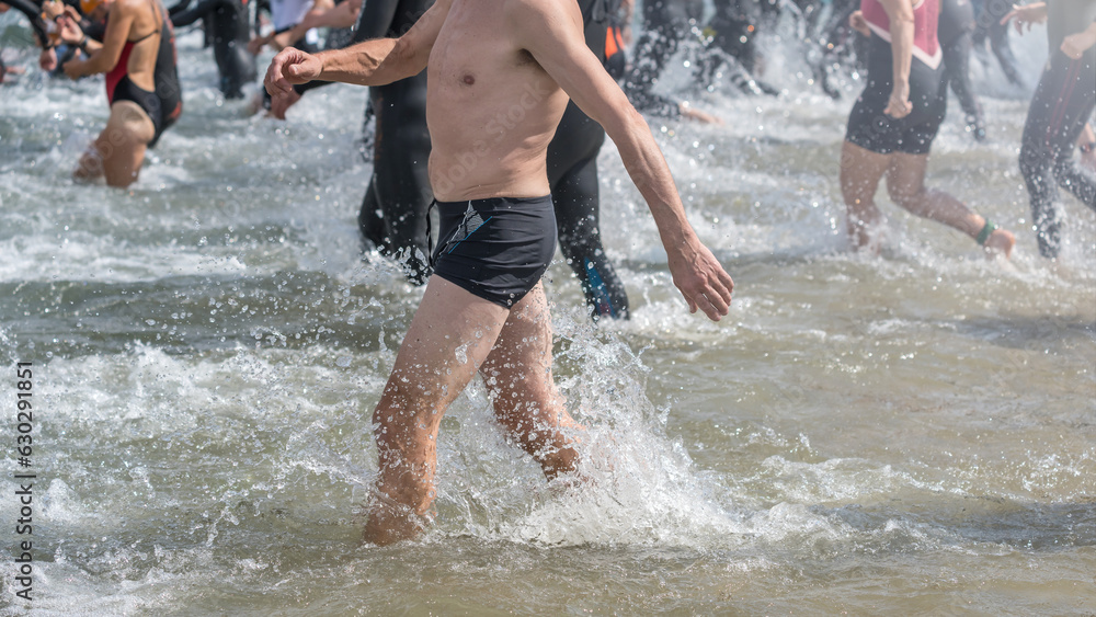 Cutout of an old man in swimming trunks running into a lake at a triathlon competition