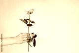 Man hand holding long stemmed single gently cream rose against a plain wall. Copy space.