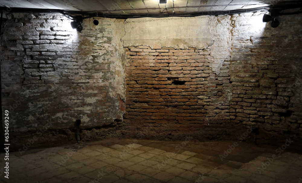 Spooky basement with pipe. red brick wall and wet tiled floor. Building under construction red brick wall . historical house. electrical wiring in corrugated pipe.