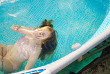 Cute teenage girl in pink swimsuit playing in a small pool.