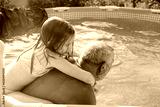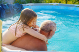 Grandpa and granddaughter play and have fun in the pool.