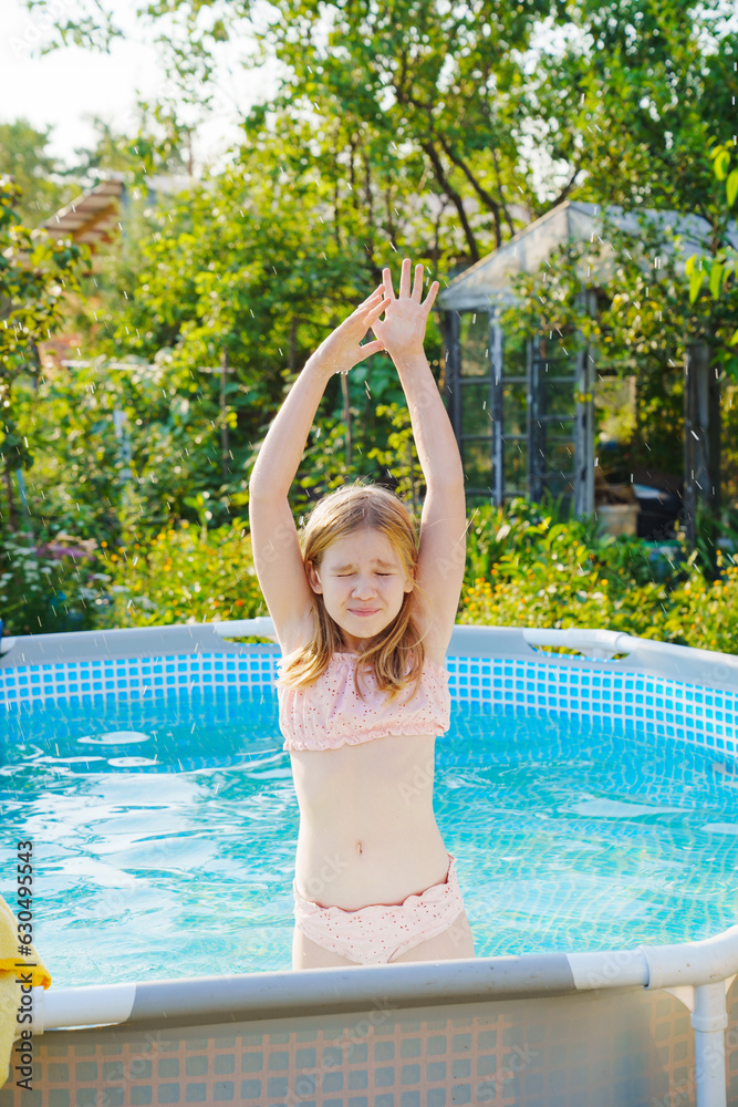 Cute teenage girl in pink swimsuit playing in a small pool.