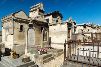 Montmartre Cemetery in Paris, France. Stone tombs under blue sky.