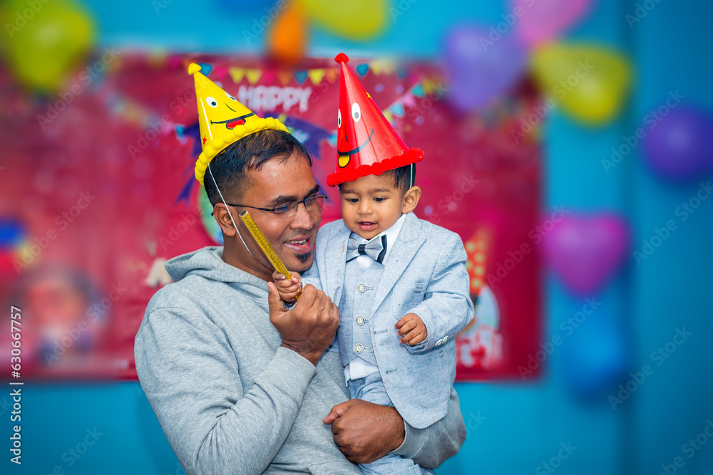 Asian child in a hat and coat-tie celebrates his birthday in his father's arms. Happy family moments of a dad and a cute child.