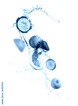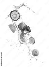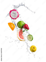 Pieces of exotic fruit in water splash