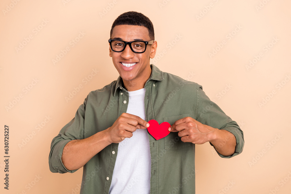Photo of pretty sweet man wear khaki shirt spectacles holding small heart chest isolated beige color background
