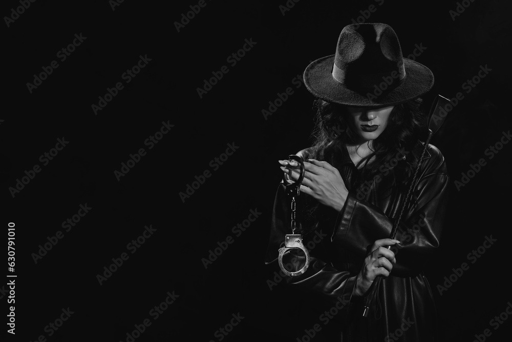 Sexy female dominant mistress with whip flogger and handcuffs for BDSM sex with submission and domination in a leather raincoat and hat in noir style