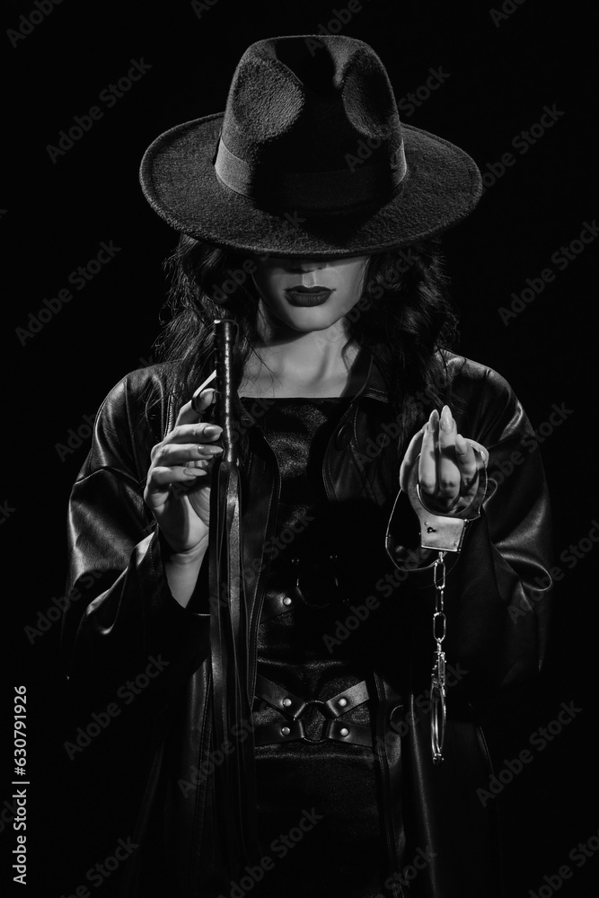 dominant woman with a leather whip flogger and handcuffs for BDSM sex with submission and domination in hands in the style of police
