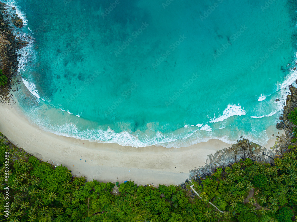 .aerial top view amazing freedom beach small white sand beach with perfect nature. .white wave hit the rock around island. .green forest peaceful. green sea, and clear sand landscape. Paradise beach..