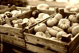 Tiny decorative pumpkins in wooden boxes. Autumn harvest on farm market, outdoor shop for Halloween and Thanksgiving day. Rural store with homegrown organic eco-friendly food. Small local business