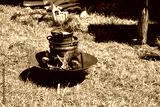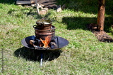 A close up on a wooden or clay pot standing on a fire pit used to melt some bee wax in order to make handmade candles and decorations seen during a medieval fair on a Polish countryside