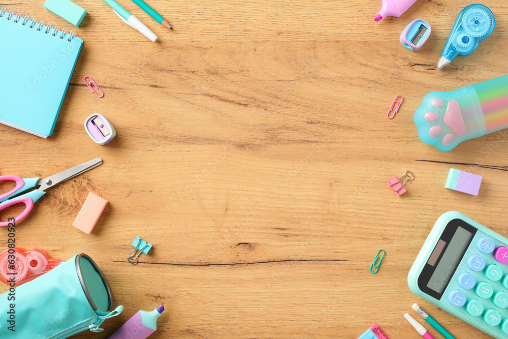 Frame of color school supplies on wooden desk table, top view. Pink and turquoise school stationery. Back to school concept.