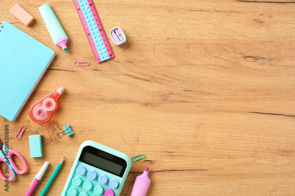 Pink and turquoise school supplies, notebook, calculator on wooden background. Flat lay, top view. Back to school concept.
