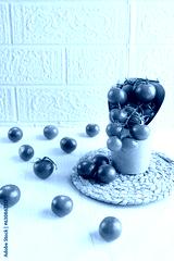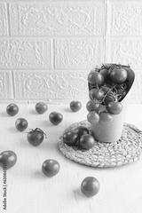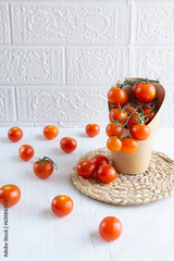 Front view of a cardboard packaging containing cherry tomatoes. Zero plastic concept. White background and white table.
