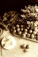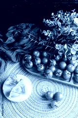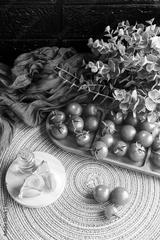 Vertical shot of a table with healthy products. Cherry tomatoes, Spanish extra virgin olive oil and garlic cloves.