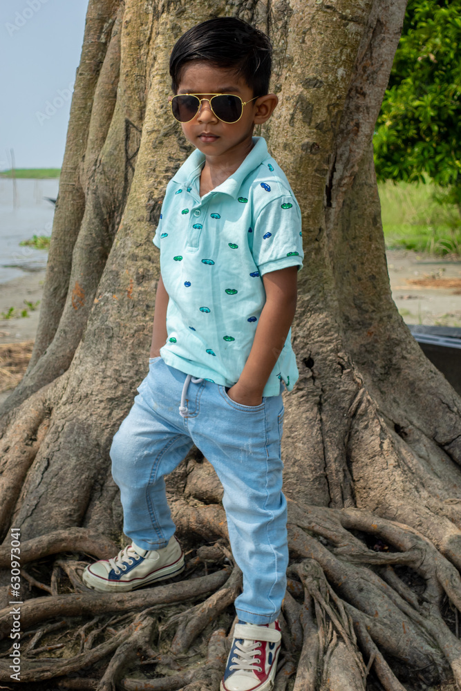 Sunglass wearing an Asian fashionable kid portrait. Polo t-shirt and jeans wearing an Asian boy.