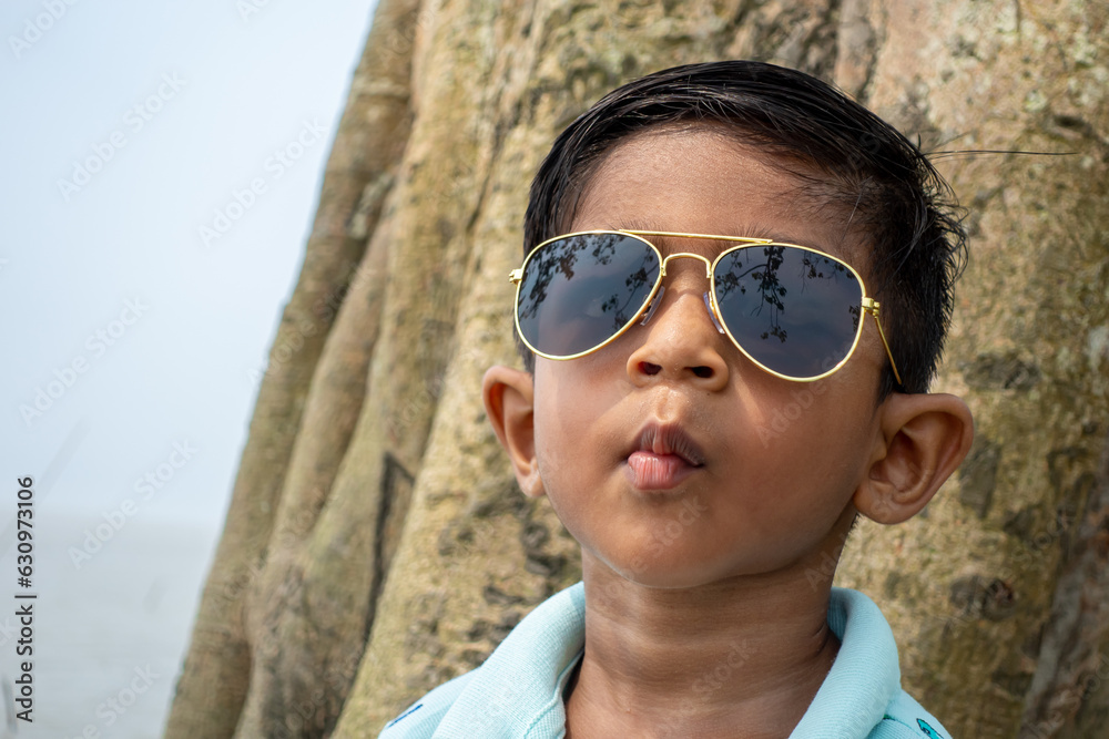 Sunglass wearing an Asian kid’s closeup portrait. Moody Asian boy looking at the camera.