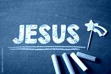 Jesus written on dark chalkboard background. Pieces of colored chalk