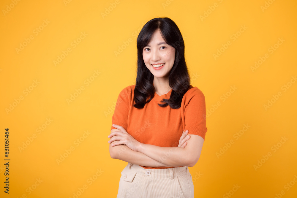 Embody confidence and poise with a young Asian woman in her 30s, donning an orange shirt, showcasing crossed arm sign gesture on yellow background.