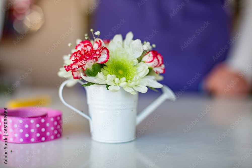 Beautiful arrangement of cut flowers in a vase on a table in the flower shop