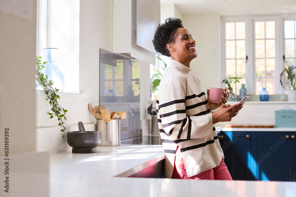 Mature Woman At Home In Kitchen Drinking Coffee And Checking Social Media On Mobile Phone