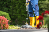 Caucasian Garden Keeper in His 40s Washing Concrete Bricks Driveway Using a Modern Pressure Washer