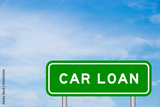 Green color transportation sign with word car loan on blue sky with white cloud background