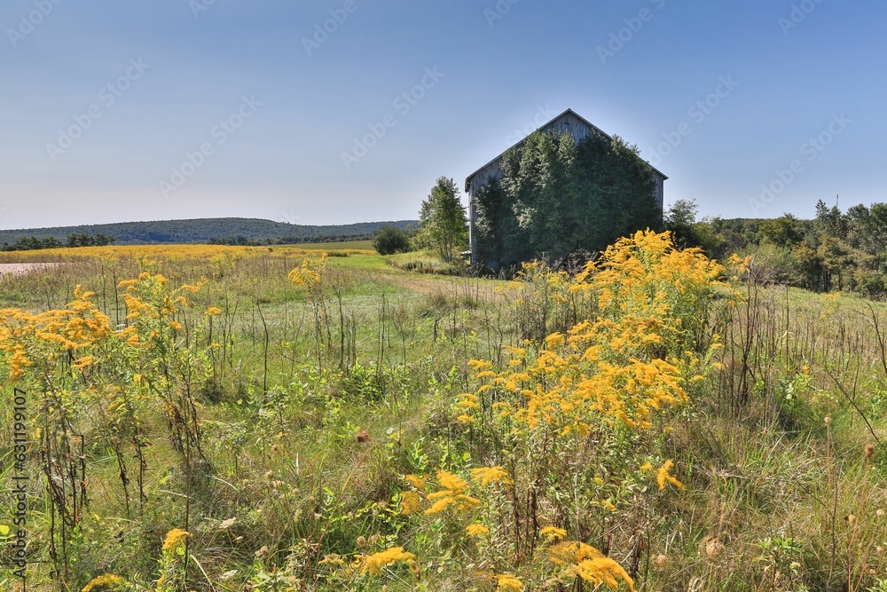 Picturesque landscape featuring a goldenrod field with an old rural structure. Western Maryland.