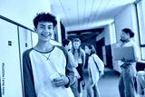 happy boy with braces holding smartphone and looking at camera during break in school hallway