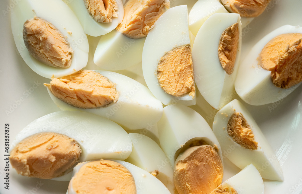Close up of a pieces of cut boiled eggs serving on white plate. Eggs are rich in protein, especially the egg whites. It's this protein that causes eggs to become hard when boiled.