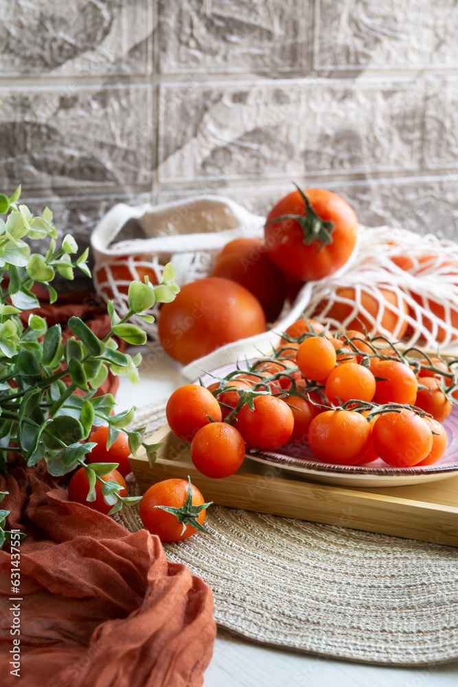 Vertical shot of red tomatoes and cherries in sustainable containers.