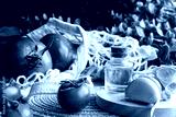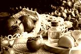 Close-up shot of healthy Mediterranean ingredients: olive oil, garlic and red tomatoes in a sustainable shopping bag.