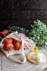 Ecologist sustainable shopping bag with red tomatoes. Olive oil and garlic at its side.