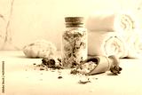 Still life with homemade roses bath salt, white towels and natural sea sponge