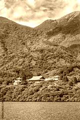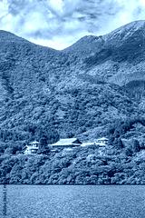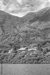 Traditional Japanese architecture on the banks of Lake Hakone, a crater lake formed in an extinct volcano in the caldera of Mount Hakone