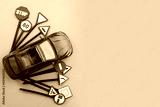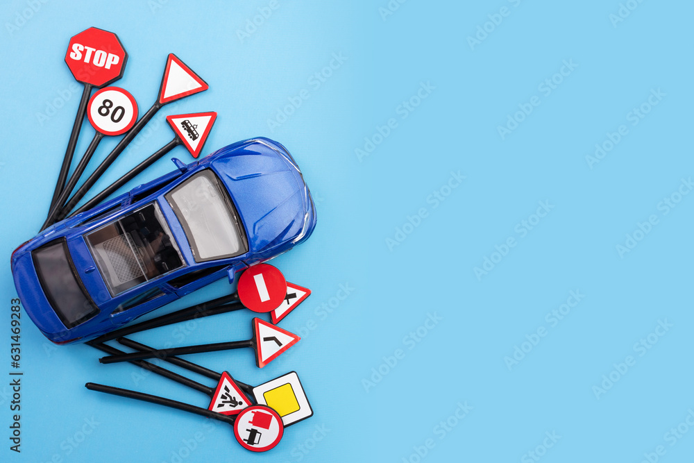 car and road signs on a blue background, copy space, necessity of car insurance and making accident claims