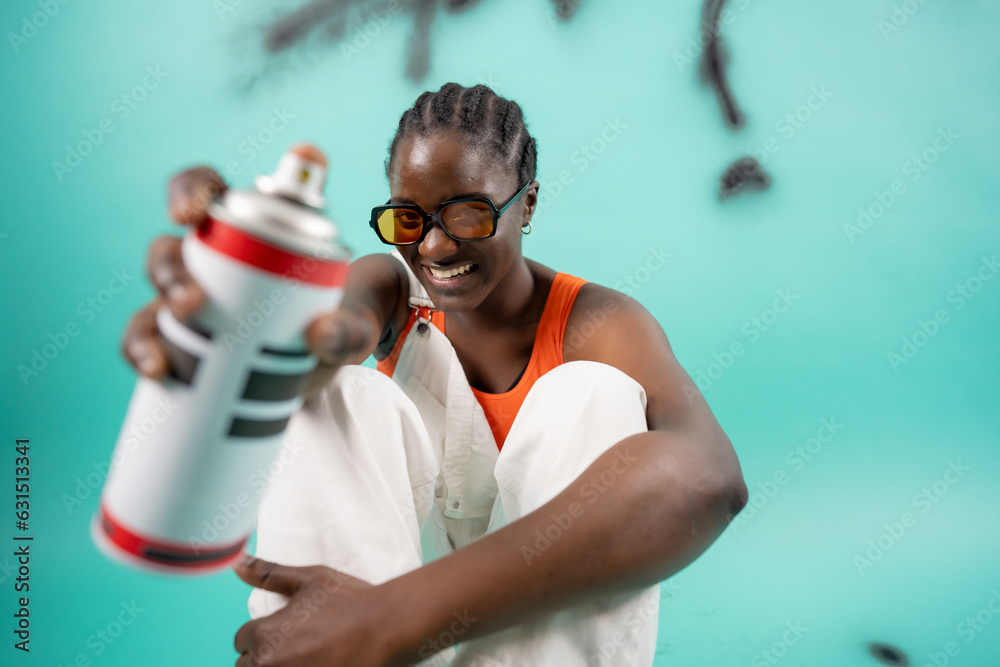 Young African American girl ethnicity hold in hand container with spray paint for graffiti