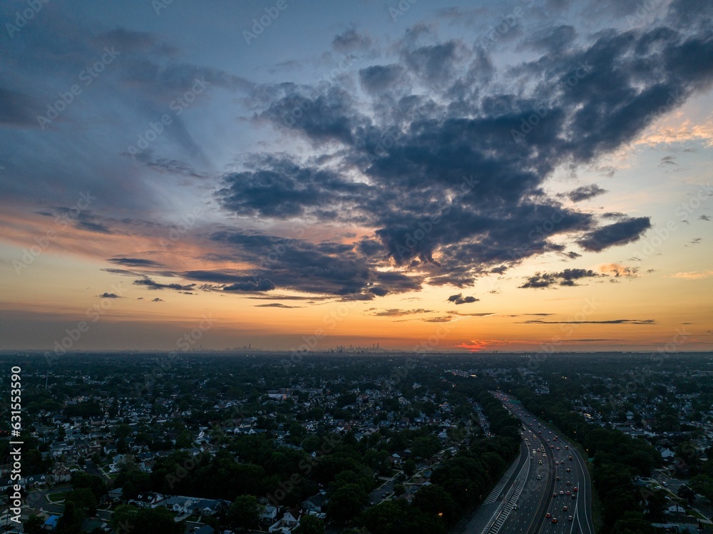 Aerial view of a cloudy but beautiful sunset over Southern State Parkway on Long Island, New York