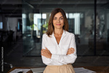 Beautiful hispanic senior business woman with crossed arms smiling at camera. European or latin confident mature good looking middle age leader female businesswoman on office background, copy space.