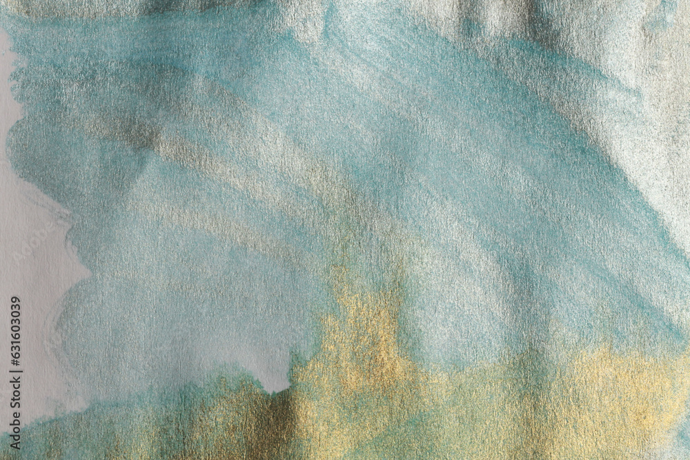 Grain wet watercolor paper texture blot painting wall. Abstract nacre gold, silver marble copy space background.