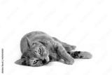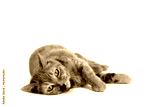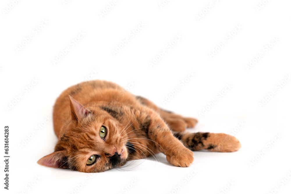 Cute brown, tabby British Shorthair Cat lying on white, isolated, looking at the camera, select focus