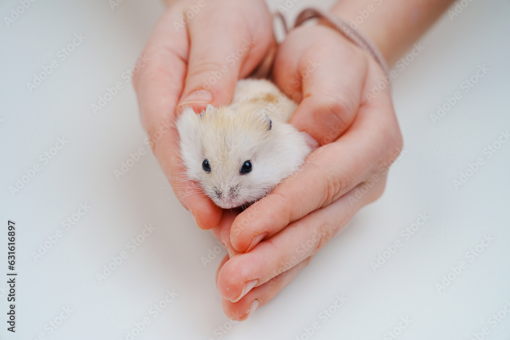 a small white with a red hamster in children's hands.