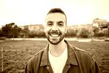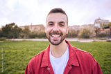 Handsome happy bearded caucasian man. Portrait of cheerful young male person standing outdoors and smiling at camera. Positive emotion concept. Millennial guy looks carefree and natural male.