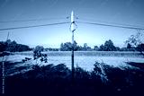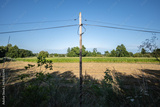 krajobraz linii elektrycznej pośrodku zielonych pól w zachodniej Polsce, jasne zielono niebieskie kolory bezchmurna pogoda