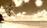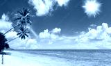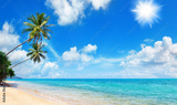 Tropical island paradise sea beach, beautiful nature landscape, coconut palm tree leaves, turquoise ocean water, sun blue sky white cloud, sand, Caribbean, Maldives, Thailand summer holidays, vacation