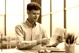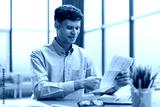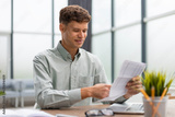 Young man is working with papers while sitting in the office. Successful entrepreneur is studying documents with attentive and concentrated look.