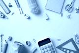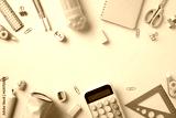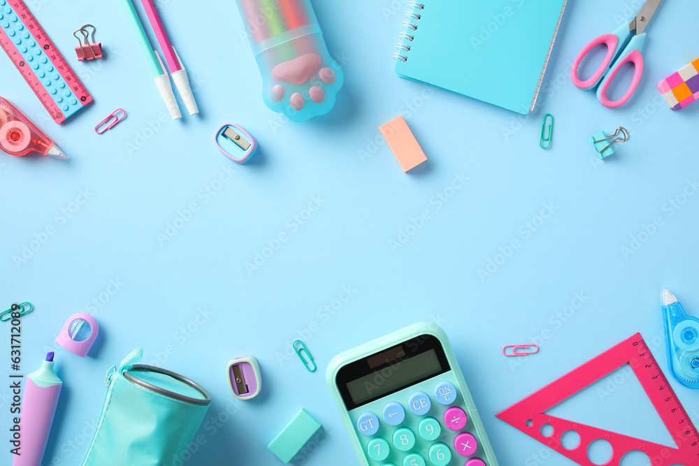 Back to school concept. Flat lay composition with modern school supplies on pastel blue background.
